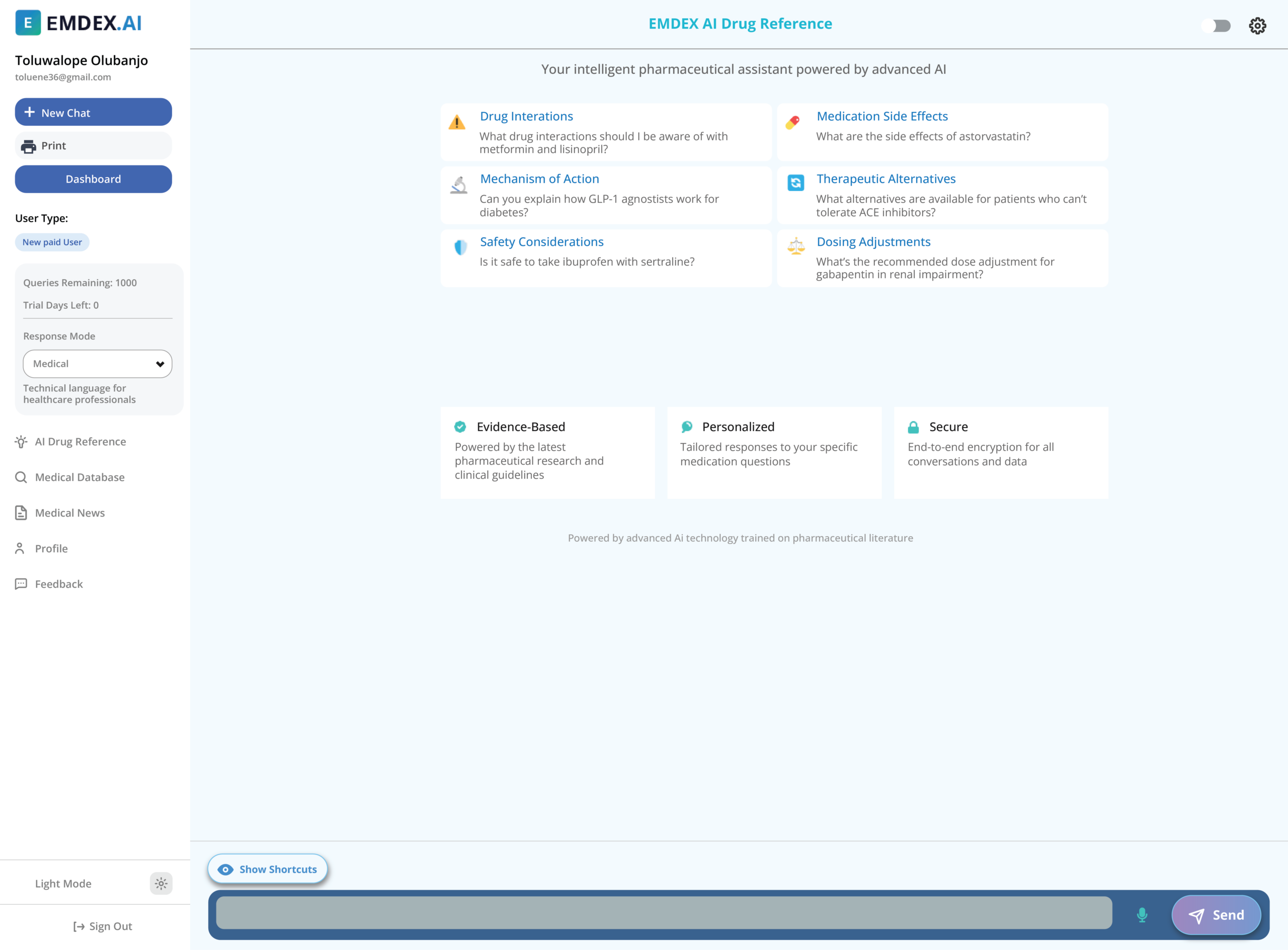 Built on Aiskyra’s precision technology, EMDEX AI brings together Nigeria’s medicines database, clinical guidelines, and an extensive library of drug-therapy literature—from PubMed to NICE, WHO, NCCN, etc. Get evidence-based answers in seconds, not minutes.